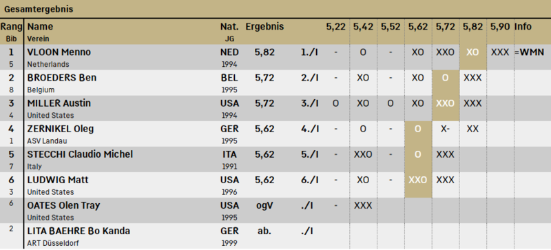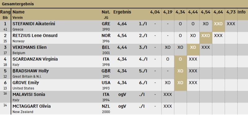 Rekordversuche für einen neuen Schweizer Rekord von 4,62, danach noch sechs über einen neuen Griechischen Landesrekord von 4,73.